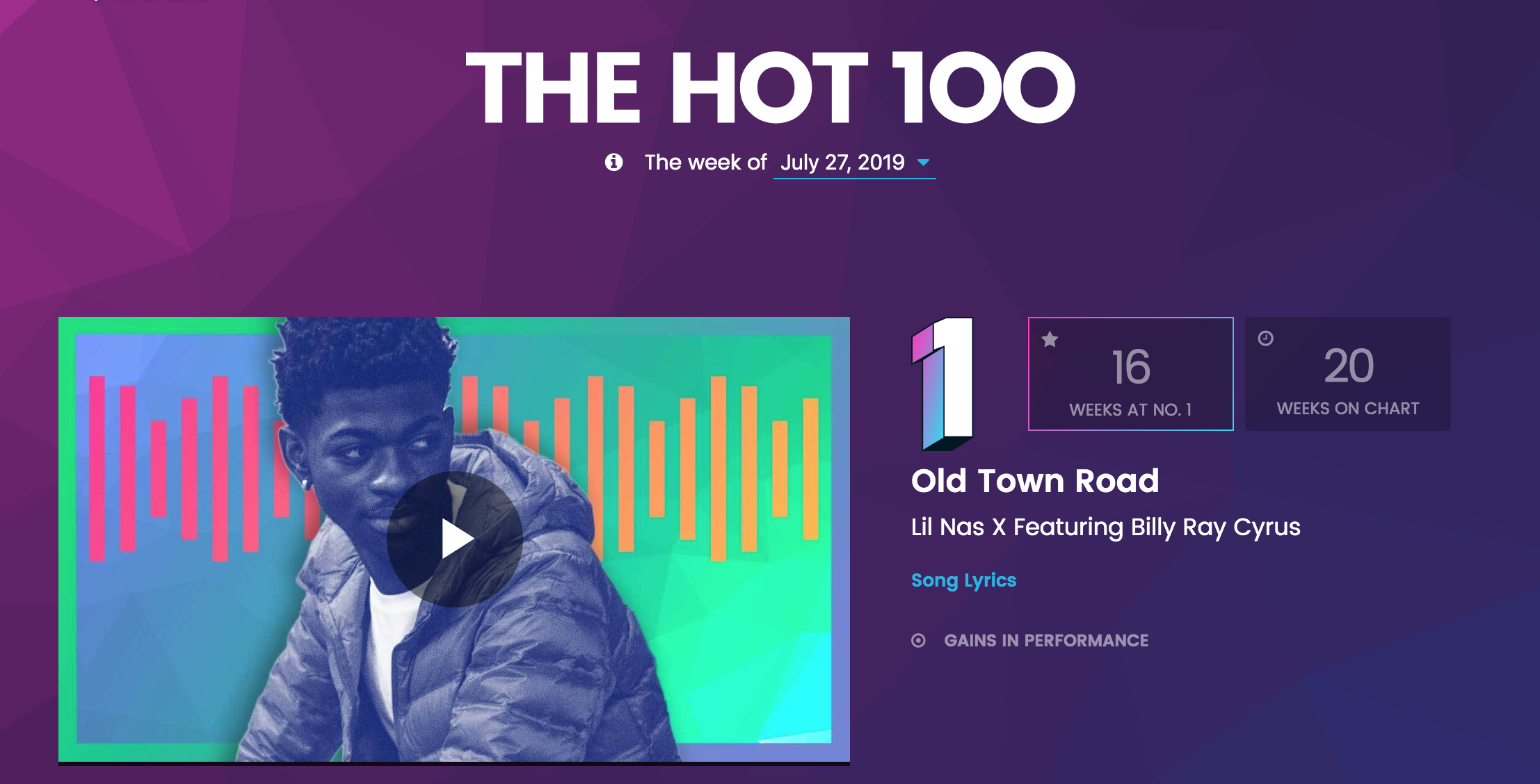 Billboard Hot 100放榜,由Lil Nas X 与 Billy Ray Cyrus 合作完成的《Old Town Road》连冠16周,创造奇迹。